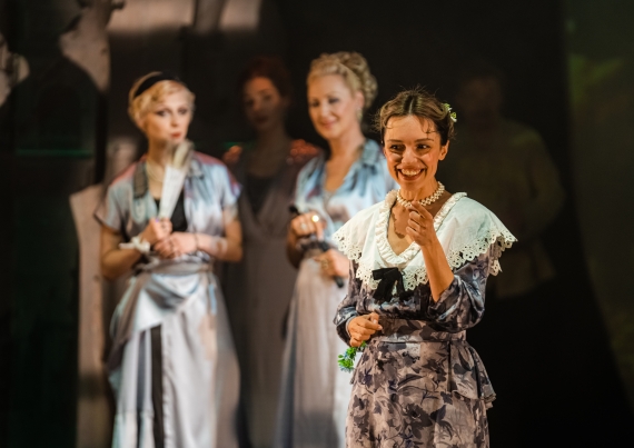О декорациях, костюмах и музыке. Все сделано интересно и органично. Удачная деталь- числе экран на заднике сцены, где появляются образы, помогающие созданию атмосферы. Лично для меня атмосфера была пронизана декадансом и овеяна модерном, за счет костюмов и репродукций чувственных картин Обри Бердслея на экране. Музыка классическая – компиляция из Вагнера, Бизе, Шопена, Штрауса, Чайковского и т.д. Декорации лаконичны – огромные фанерные дамы и кавалеры, да десяток стульев. Но ведь дело не в роскоши того, что на сцене, а в том, как это используют артисты.